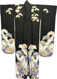 1月は、町内の呉服店にあった、正絹の五つ紋入りの振袖を展示します。大正末から昭和初期の品とされ、松・牡 丹・菊・花菱七宝・青海波などの吉祥模様に鶴が舞う姿が華やかに描かれています。